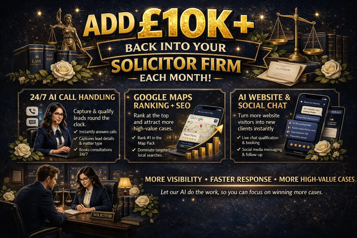 This is not just SEO. It is a joined-up client capture system for solicitor firms: Google Maps ranking, SEO, AI call handling, AI website and social chat, CRM follow-up, review generation and cleaner enquiry tracking.